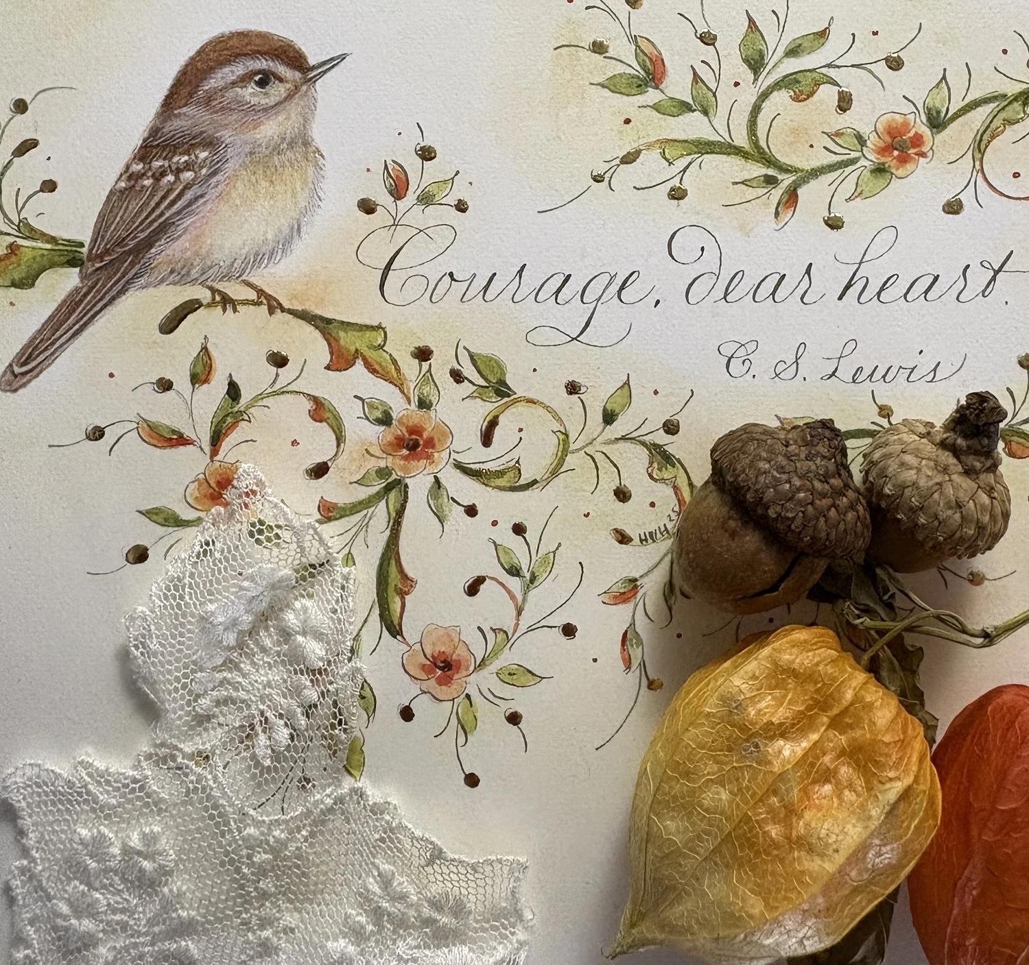When she is not working with her pointed pen, studying medieval and renaissance illumination or botanical painting techniques, Heather enjoys walking in nature which is her inspiration.