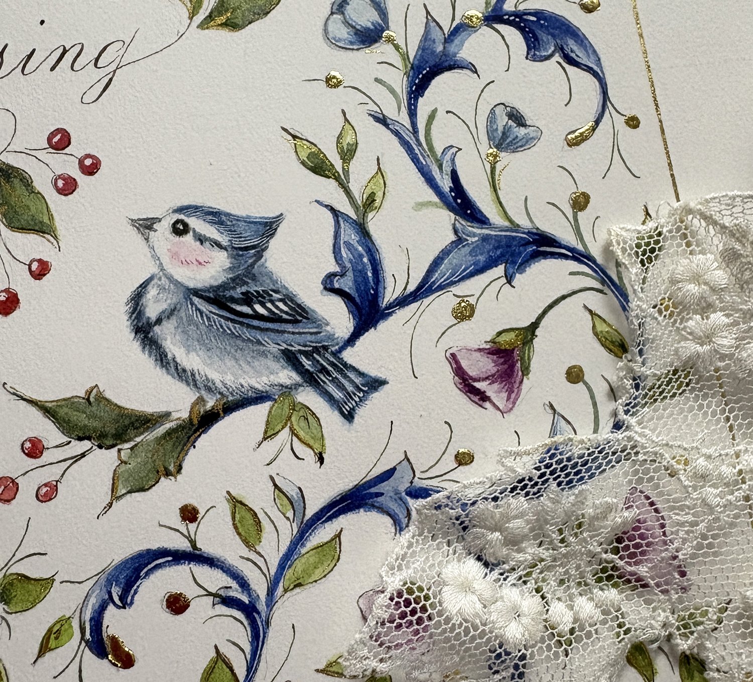This piece blends Heather Held’s love of Rinceau designs with influences drawn from her ongoing study of Beatrix Potter. Created while watching bluejays visit her garden, the artwork reflects joy, delicacy, and a reverence for nature’s quiet beauty.