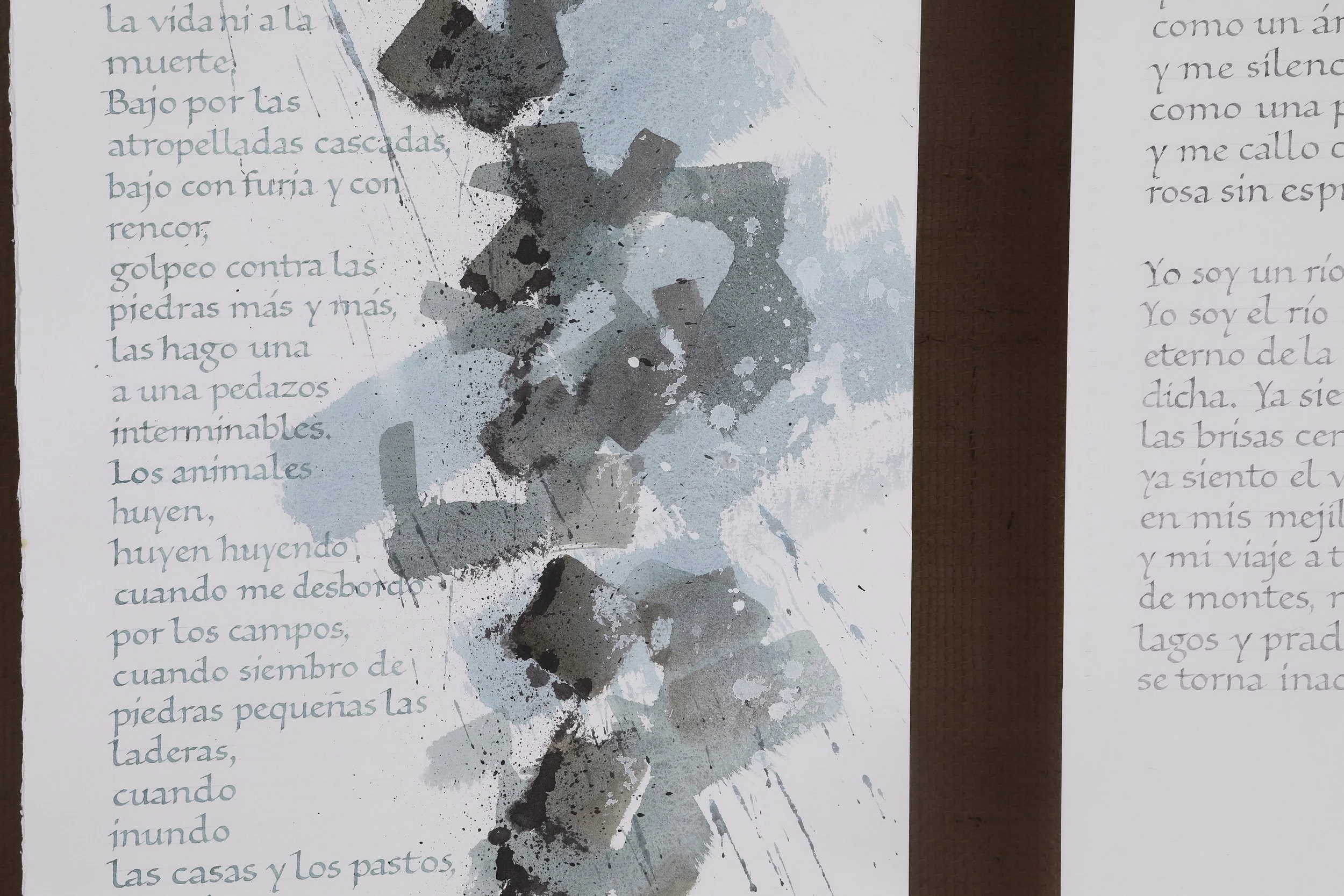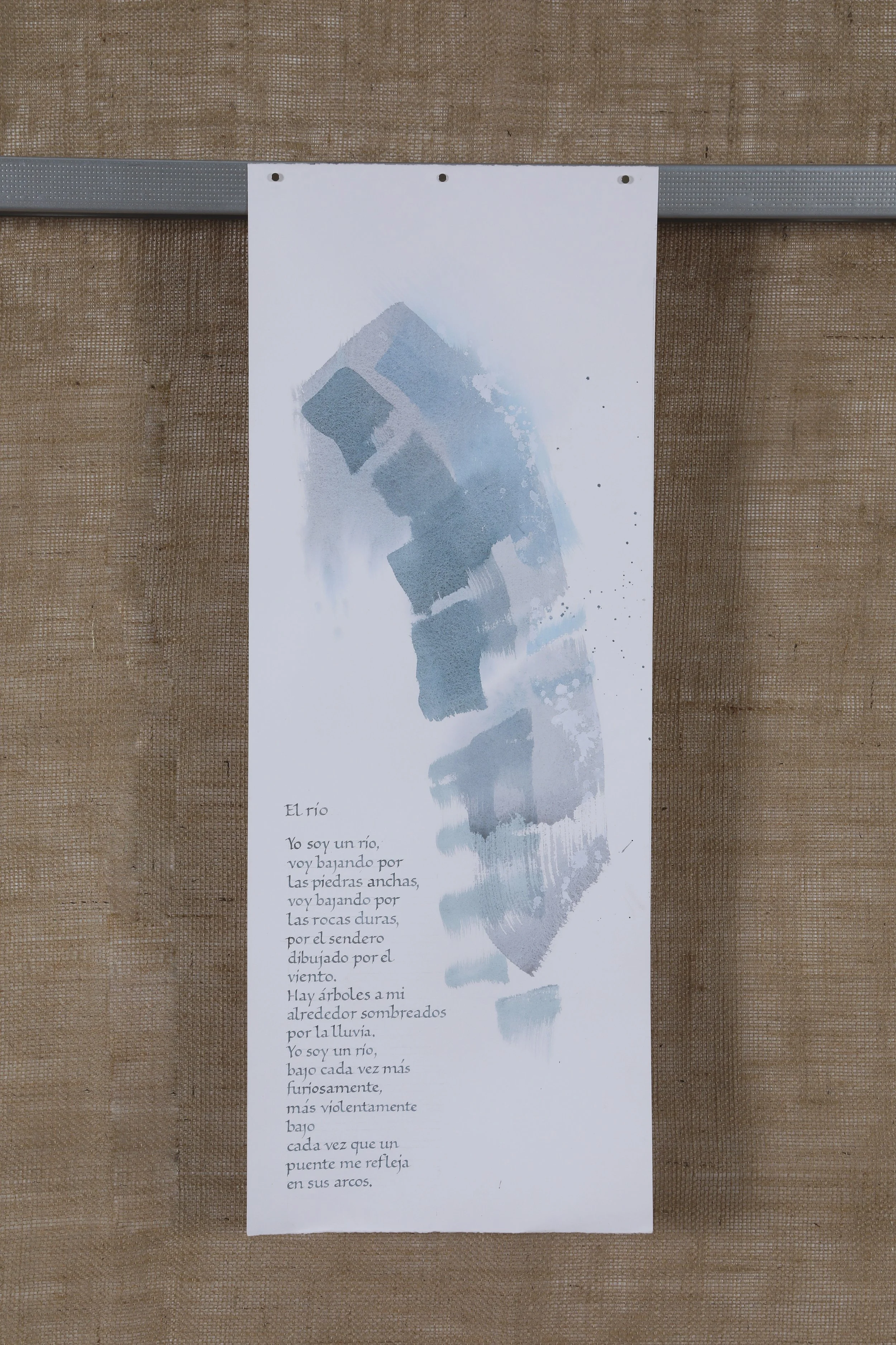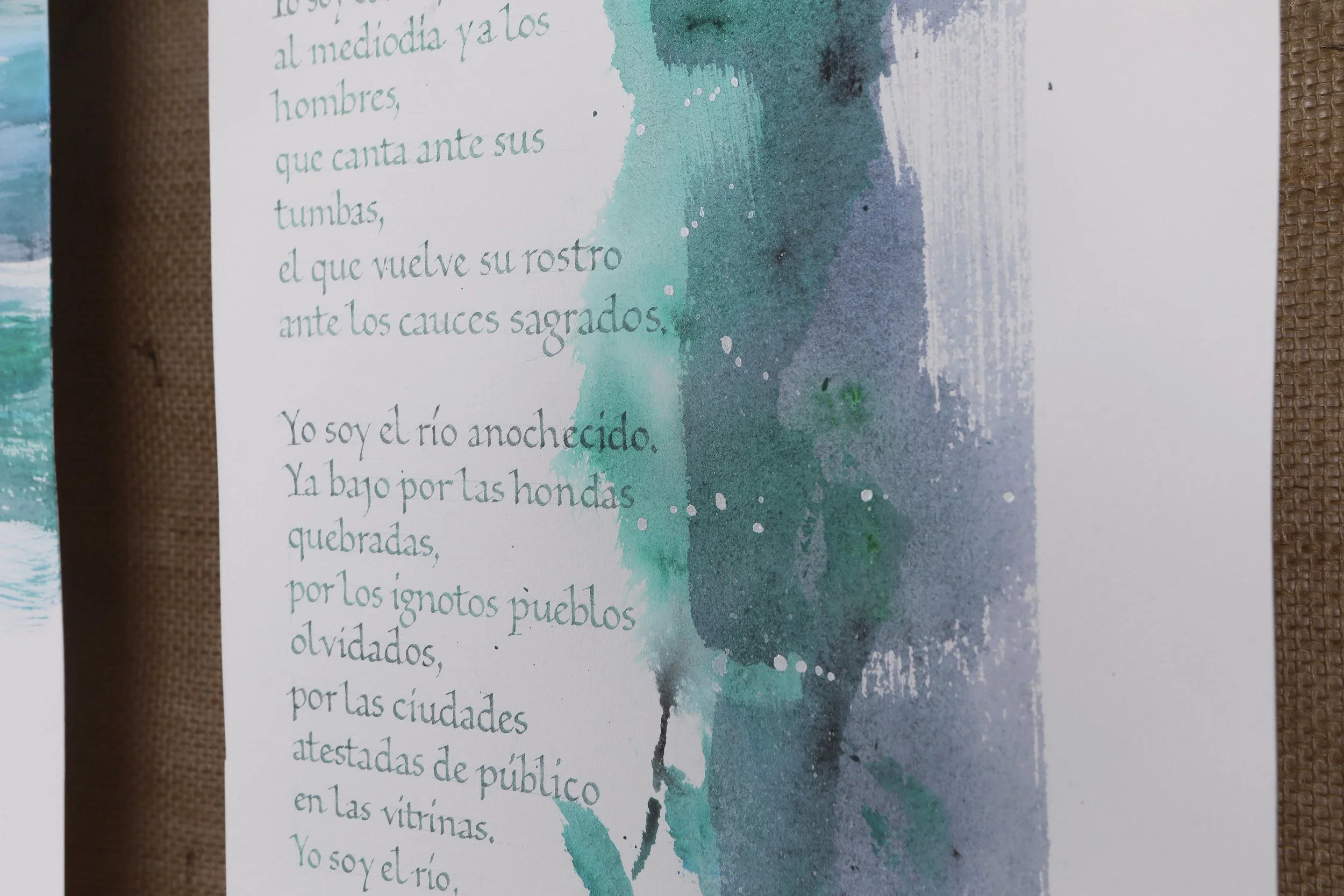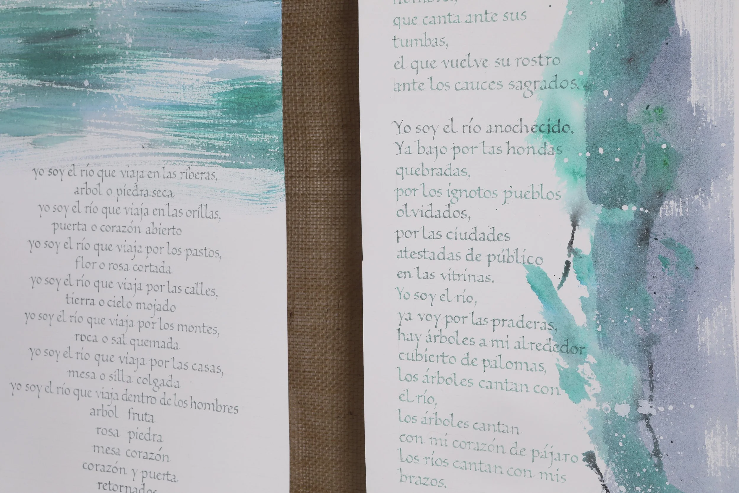 Seven panels written in Foundational calligraphy and illustrated on Hahnemühle paper. The text is taken from the Spanish poem El Río by Javier Heraud (1934–1963), reflecting the lyrical flow and contemplative imagery of the original work.