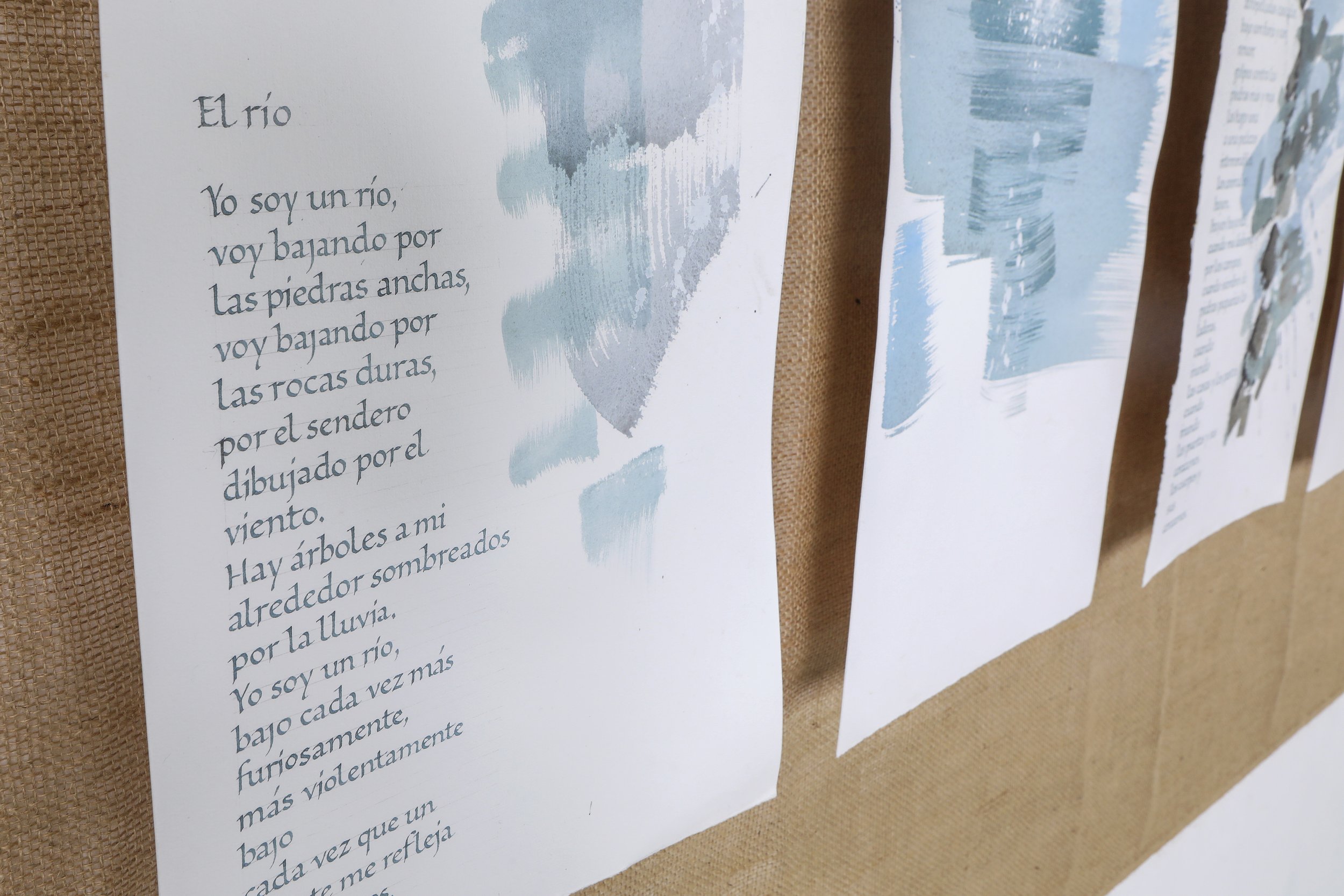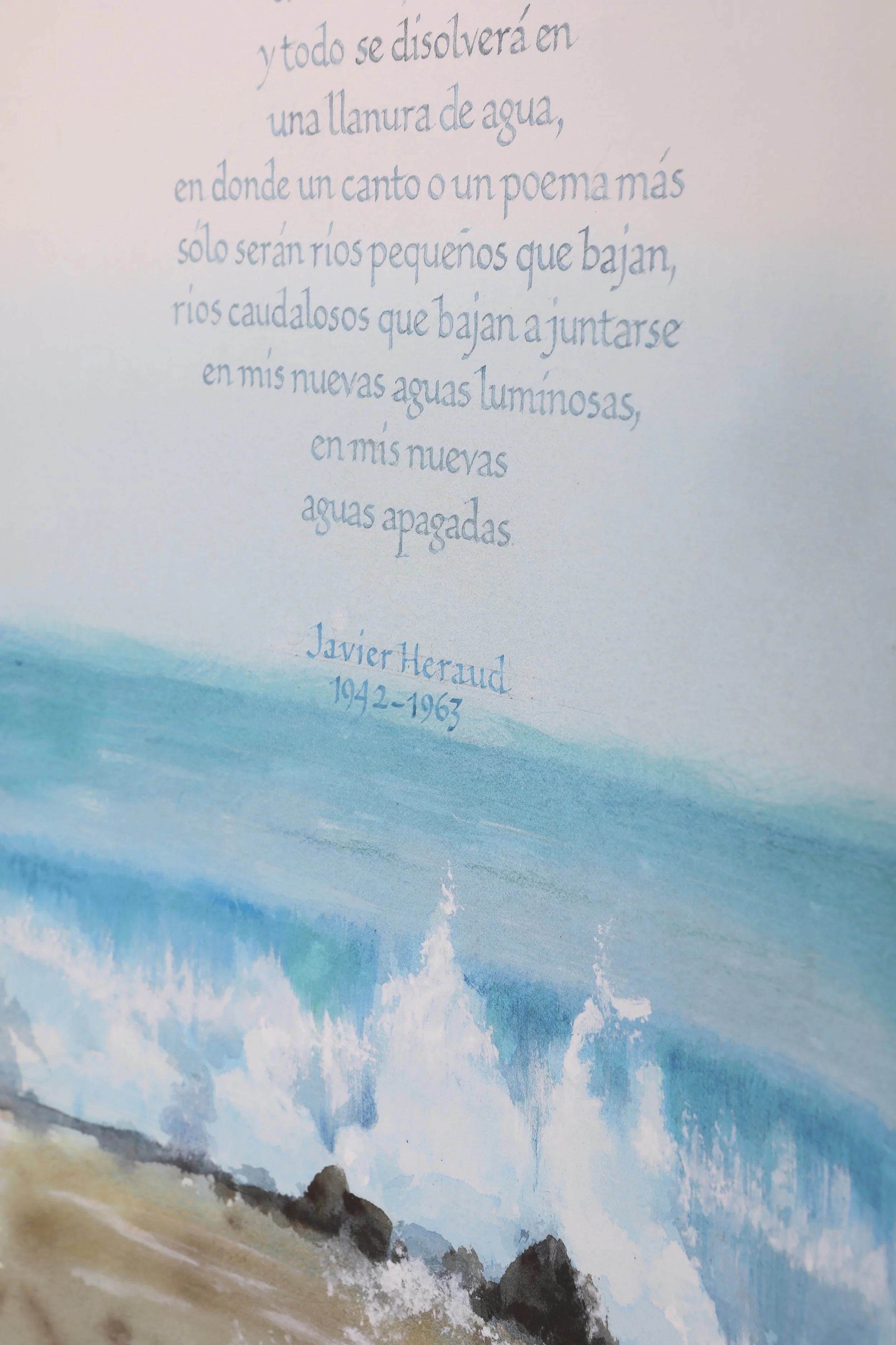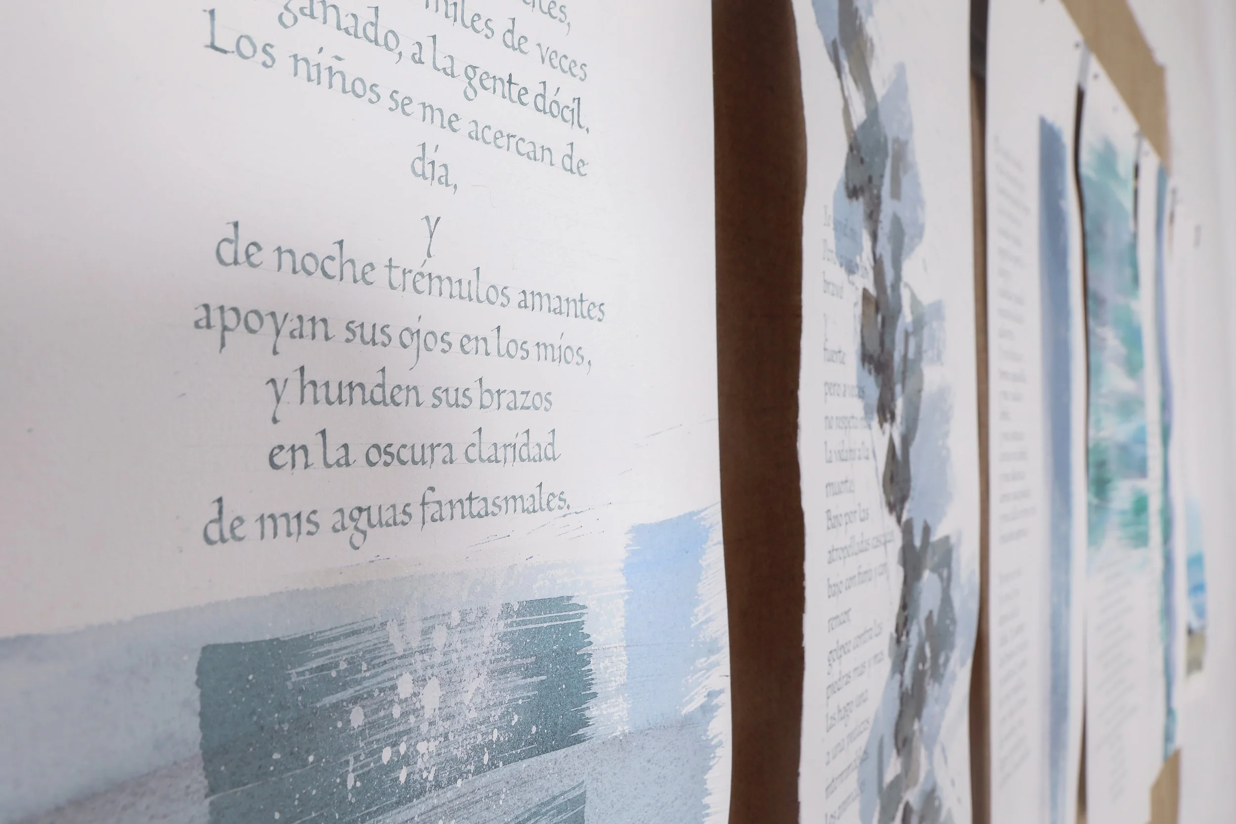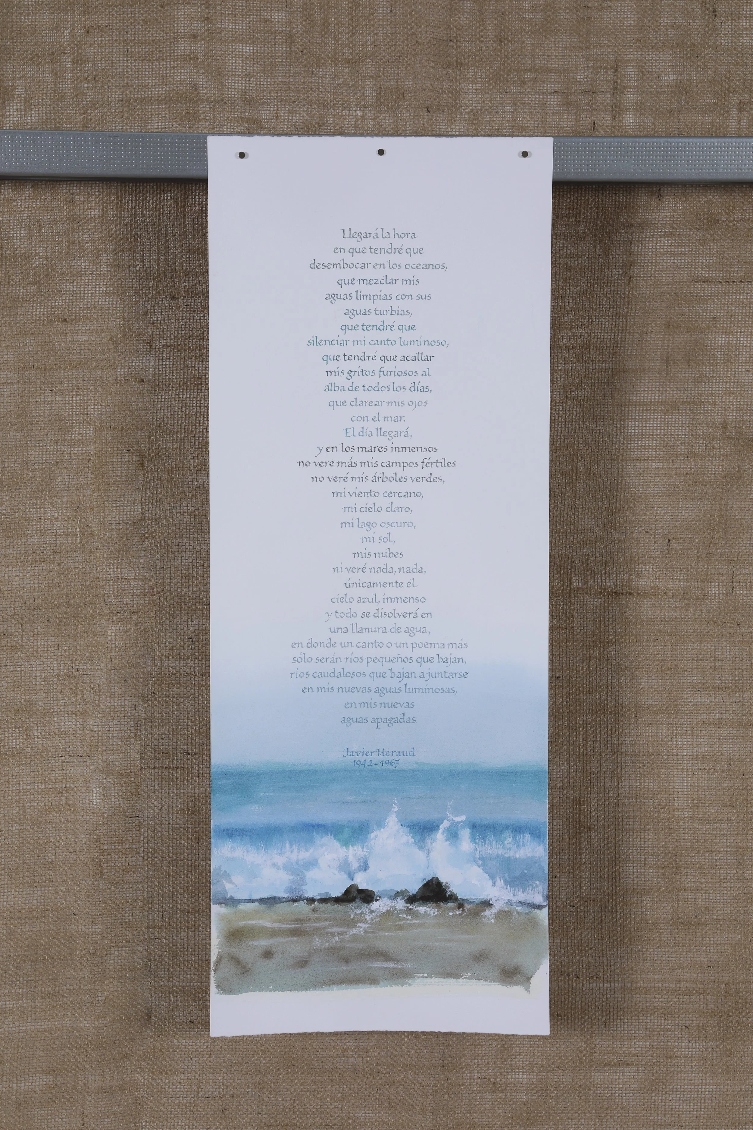 Seven panels written in Foundational calligraphy and illustrated on Hahnemühle paper. The text is taken from the Spanish poem El Río by Javier Heraud (1934–1963), reflecting the lyrical flow and contemplative imagery of the original work.
