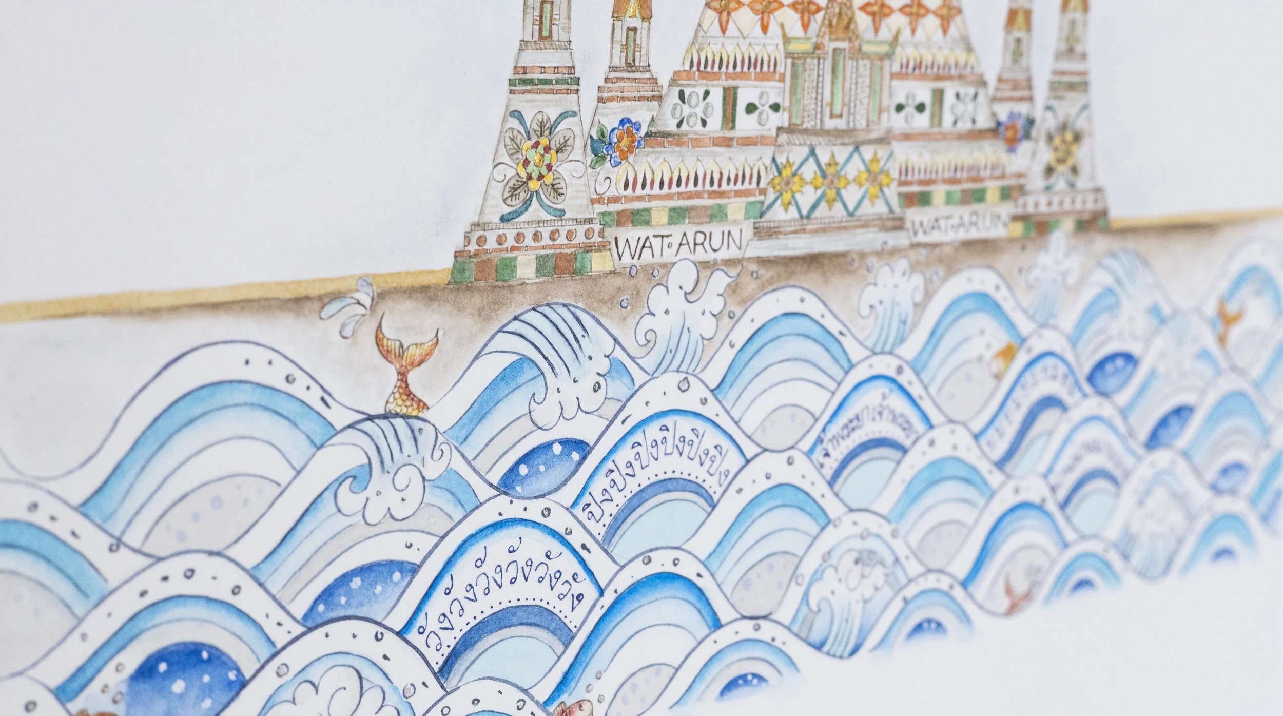 Inspired by one of Thailand’s most iconic landmarks, “Wat Arun” or the “Temple of Dawn,” this piece pays tribute to its centuries-old architecture and spiritual presence along the Chao Phraya River. Kunnatee captures the beauty, symmetry, and historic resonance that have inspired generations of artists.