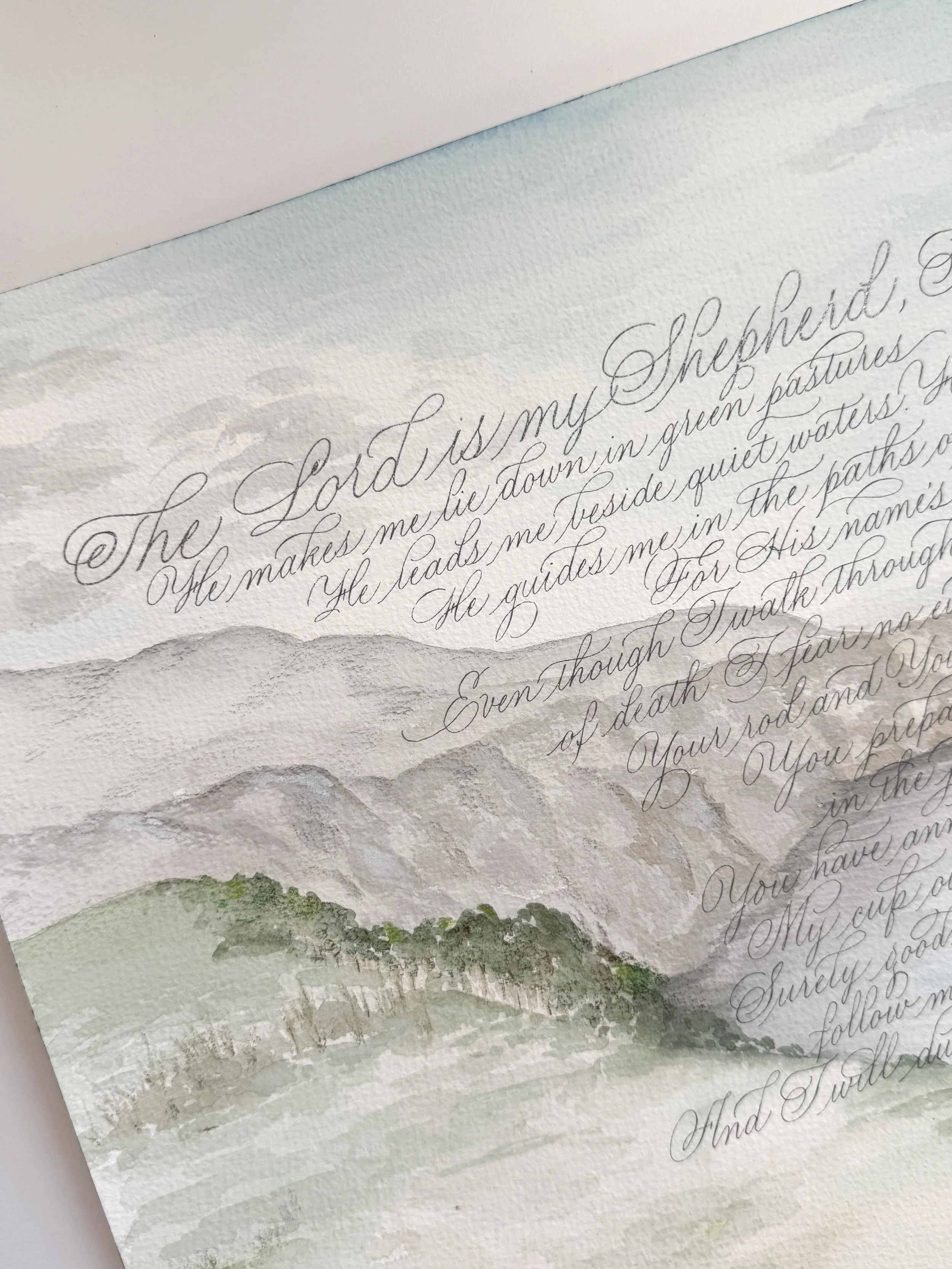 Psalm 23 holds deep personal meaning for the artist, being her parents’ favorite passage. She read it with them often during their hospice care, where its words brought peace and comfort in their final days. The background is inspired by a photograph from their last family trip to Channel Island, merging memory, faith, and place into a tender act of remembrance.
